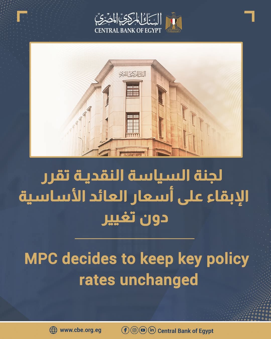 قررت لجنة السياسة النقديـة للبنك المركــزي المصـري في اجتماعهـا يــوم الخميس الموافـــق 2 إبريل 2026 الإبقاء على أسعار العائد الأساسية دون تغيير. وعليه، تقرر تثبيت سعري عائد الإيداع والإقراض لليلة واحدة وسعر العملية الرئيسية للبنك المركزي عند 19.00% و20.00% و19.50%، على الترتيب. كما تم الإبقاء على سعر الائتمان والخصم عند 19.50%. ويأتي هذا القرار انعكاسا لرؤية اللجنة لآخر تطورات التضخم وتوقعاته منذ اجتماعها السابق.