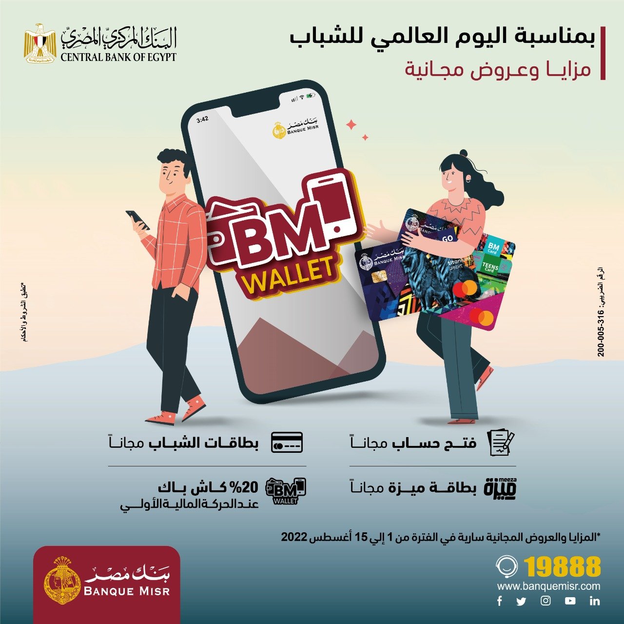 هذا وقد حرص البنك بمناسبة “اليوم العالمي للشباب” والتي تستمر فعالياته خلال الفترة من 1 الى 15 أغسطس 2022 ، على توفير العديد من المزايا والعروض المجانية التي تخدم كافة العملاء وبالأخص فئة الشباب كونهم الفئة الأكبر اتساعاً في المجتمع ومنها؛ فتح حسابات للعملاء الجدد بدون مصاريف وبدون حد أدنى لفتح الحسابات وتحمل البنك مصروفات الدمغة اللازمة لفتح الحسابات، مع اصدار بطاقة ميزة للخصم الفوري أو البطاقة الكلاسيكية للخصم الفوري مجاناً، بالنسبة للعملاء الأقل من 16 سنة يتم الاعفاء من مصاريف اصدار البطاقة المدفوعة مقدماً( TEENS) ضمن برنامج الشباب مع إمكانية استخدامها في المشتريات من خلال المنافذ التجارية أو أونلاين من خلال الانترنت دون الحاجة لفتح الحسابات ، بالنسبة للعملاء من سن 16 عام إلى 21 عام يتم فتح الحسابات مجاناً مع اصدار بطاقة (BM) مجاناً، بالنسبة للعملاء من سن 21 عام إلى35 عام يتم فتح الحسابات مجاناً مع اصدار بطاقة (GO )، أما بالنسبة للعملاء مستخدمي تطبيق محفظة بنك مصر الالكترونية BM Wallet يتم استرداد 20 % من الحركة المالية الاولي مع تطبيق الشروط المنظمة لذلك.