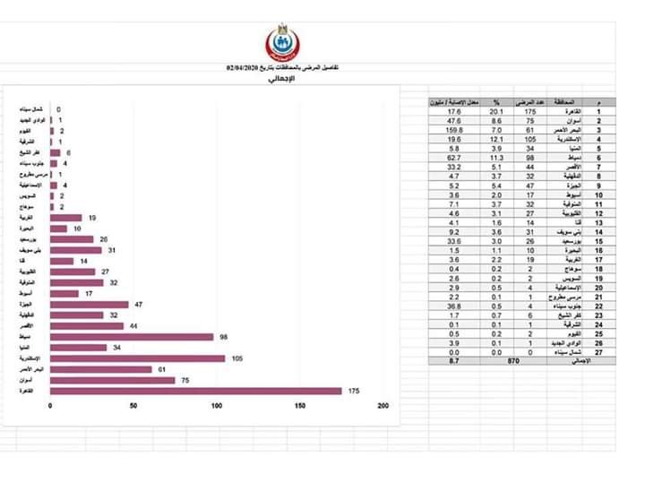 كشف منشور حصلت عليه “ايجي ايكونومي ” تدواله رواد موقع التواصل الاجتماعي ” فيس بوك ” يحمل شعار وزارة الصحة المصرية عن تفاصيل انتشار حالات فيروس كورونا في محافظات الجمهورية، حيث سجلت محافظة القاهرة أعلى معدلات إصابة بإجمالي 175 حالة، وفي الإسكندرية بلغ عدد الإصابات 105 حالات وبالبحر الأحمر 61 حالة .