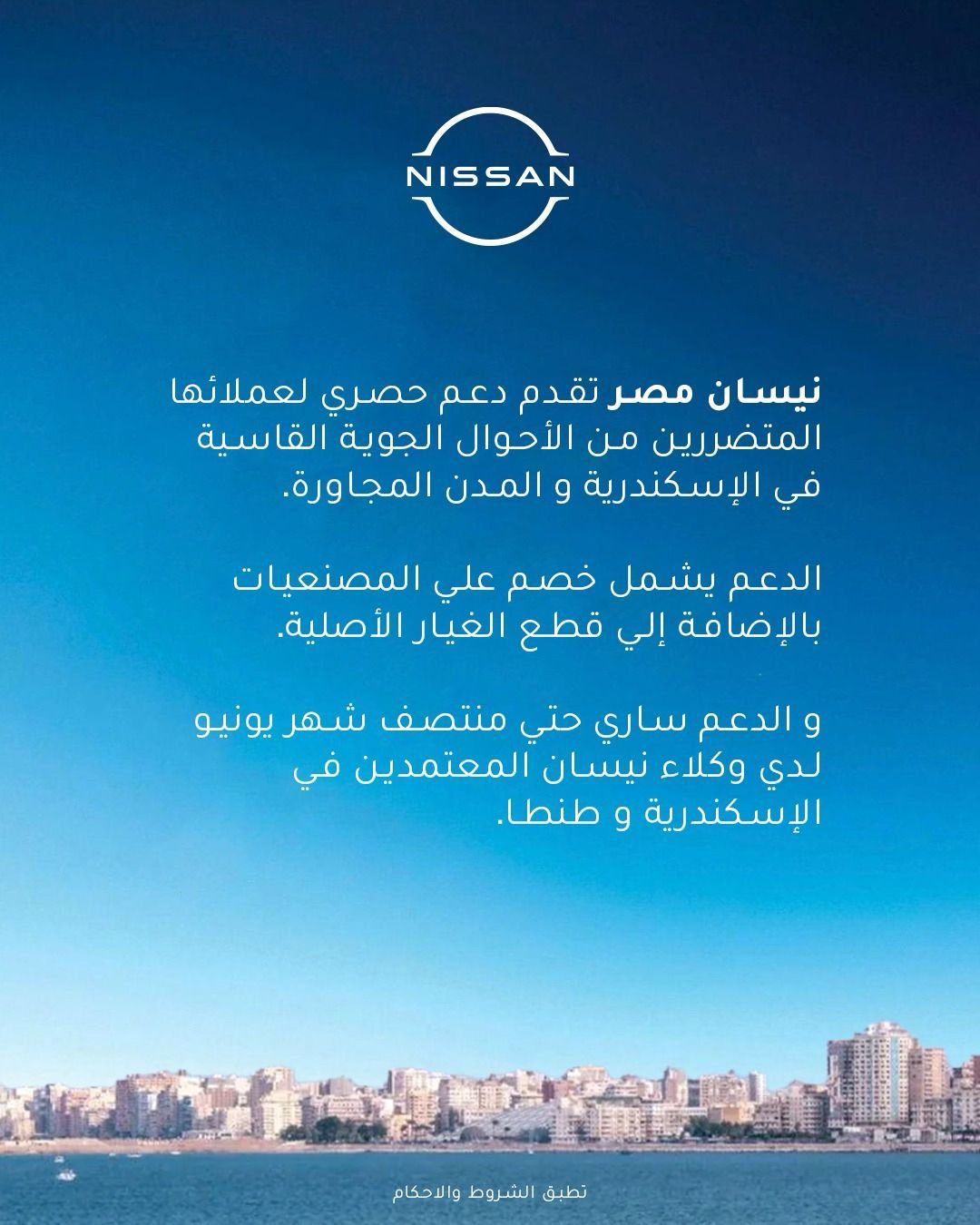تجسد هذه المبادرة استجابة نيسان السريعة والتزامها المتواصل بدعم عملائها في الأوقات الصعبة. تشمل الخصومات عملاء نيسان في الإسكندرية والمناطق المتأثرة، لمساعدتهم على إصلاح الأضرار التي لحقت بمركباتهم، كما تؤكد هذه المبادرة أن الشركة جزءٌ لا يتجزأ من نسيج المجتمع المصري، بفضل علاقتها الممتدة مع العميل المصري لأكثر من عشرين عامًا تمكنت خلالها من بناء روابط وعلاقات قائمة على الثقة، والولاء، وجودة المنتجات والخدمات.