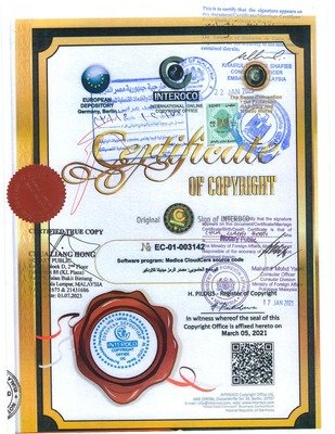 المستند السادس: مستندات تفيد إيداع برنامج الحاسب Medica CloudCare في جهة الإيداع الأوربية ببرلين European Depository, Germany, Berlin ، وتتمثل في مركز معتمد أوروبيًا لإيداع برامج الحاسب، إعمالًا لاتفاقية برن لحماية المصنفات الأدبية والفنية، وهي اتفاقية نافذة في مصر حيث تم الانضمام إليها بالقرار الجمهوري رقم 591 لسنة 1976المنشور بالجريدة الرسمية( السنة 20، العدد 24 ص 608).