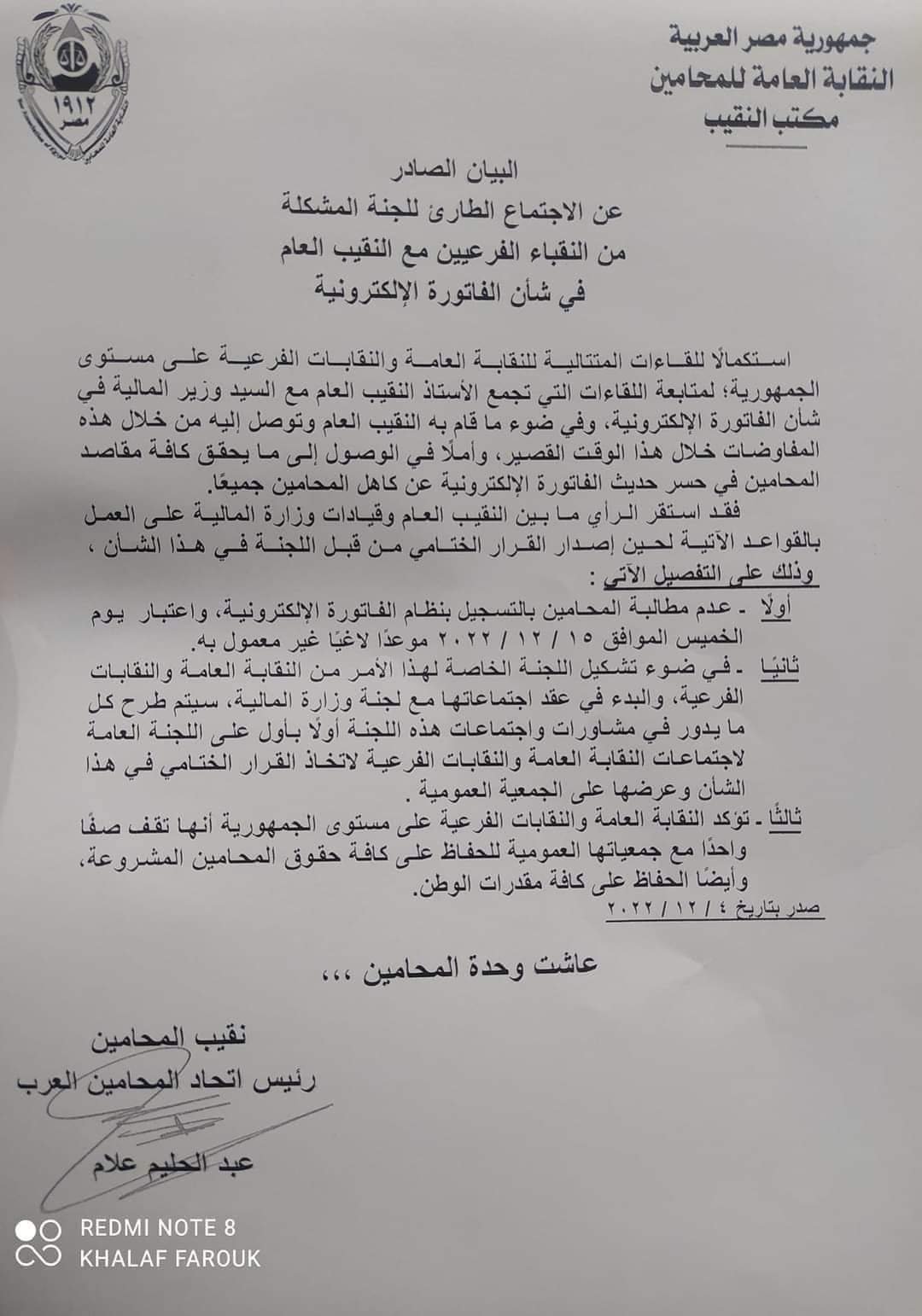 وفقا لبيان متداول علي صفحات التواصل الاحتماعي و منسوب لنقيب المحامين، تقرر عدم مطالبة المحامين بالتسجيل بنظام الفاتورة الإلكترونية، واعتبار يوم الخميس الموافق 15 ديسمبر الجاري موعدا لاغيا غير معمول به.