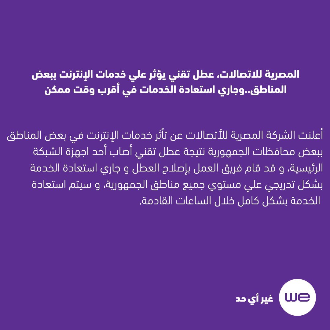 أعلنت الشركة المصرية للأتصالات عن تأثر خدمات الإنترنت في بعض المناطق ببعض محافظات الجمهورية نتيجة عطل تقني أصاب أحد اجهزة الشبكة الرئيسية، و قد قام فريق العمل بإصلاح العطل و جاري استعادة الخدمة بشكل تدريجي علي مستوي جميع مناطق الجمهورية، و سيتم استعادة الخدمة بشكل كامل خلال الساعات القادمة