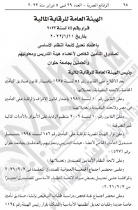 أصدر الدكتور محمد عمران رئيس الهيئة العامة للرقابة المالية، قرارًا رقم 45 لسنة 2022، باعتماد تعديل لائحة النظام الأساسي لصندوق التأمين الخاص لأعضاء هيئة التدريس ومعاونيهم والعاملين بجامعة حلوان.