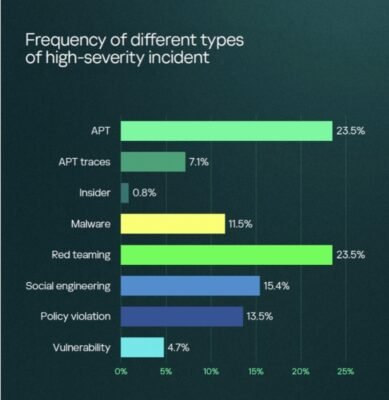 وكانت نسبة انتهاكات سياسات الأمن أقل من 14% من إجمالي الحالات، وشملت حسابات شرعية قامت بأنشطة مشبوهة مثل جمع وتسريب البيانات. وكانت نسبة حوادث البرمجيات الخبيثة أقل من 12%، بينما عُثر على آثار لهجمات سابقة، أو آثار لتهديدات مستعصية متقدمة (APT)، في أكثر من 7% من الحالات. وتم اكتشاف ثغرات أمنية في أقل من 5% من الحوادث مع أنه لا يُعد محور التركيز الأساسي لخدمة الاكتشاف والاستجابة المدارة في كاسبرسكي.