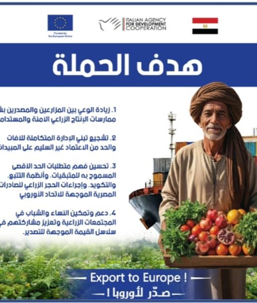 في إطار الجهود الرامية إلى دعم تنافسية الصادرات الزراعية المصرية وتعزيز امتثالها للمعايير الأوروبية والدولية، تنطلق منتصف فبراير 2026 حملة التوعية الميدانية “صدّر لأوروبا” بمحافظات بني سويف، وأسيوط، وسوهاج، وذلك ضمن برنامج الاتحاد الأوروبي للتنمية الريفية المتكاملة في مصر (EU-ZIRA3A)..