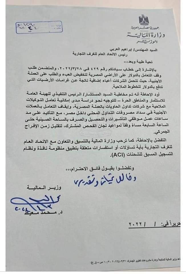 و نص الخطاب الذي وجهه وزير المالية الدكتور محمد معيط للمهندس ابراهيم العربي رذيس الاتحاد العام للغرف التجارية واطلعت إيجي ايكونومي على نسخة منه على رد الوزير على طلب العربي بوقف التعامل بالدولار على الاراضى المصرية لتخفيض العبء و الطلب على العملة الاجنبية ، حيث طلبت الوزارة رأي الرذيس التنفيذي للهيئة العامة للاستثمار و المناطق الحرة.