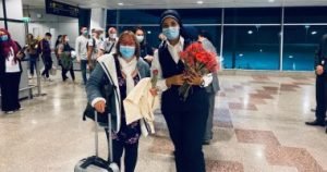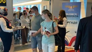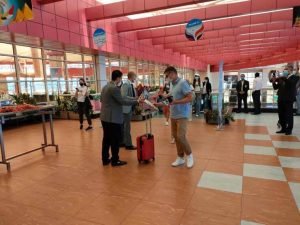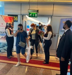 وقام فريق العلاقات العامة بالمطار باستقبال الركاب وتقديم الورود والشوكولاته وبعضالهدايا التذكارية مع اتخاذ كافة الإجراءات الإحترازية والوقائية بالمطار ومراجعة تقديم شهادات الـPcr وشهادات تطعيم لقاحات كورونا مع الركاب.