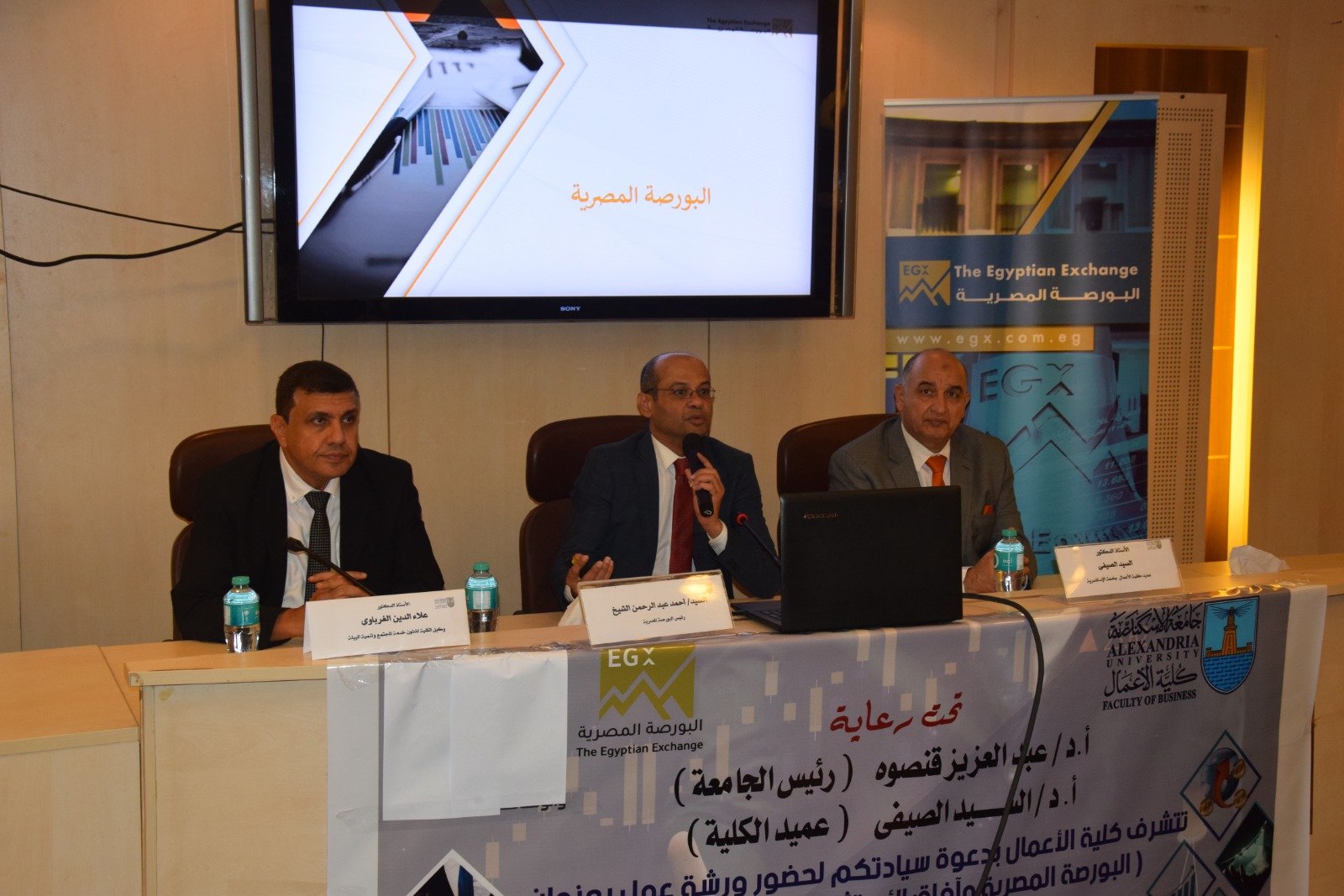 شارك أحمد الشيخ – رئيس البورصة المصرية كمتحدث رئيسي في ورشة عمل نظمتها كلية الأعمال بجامعة الإسكندرية بعنوان “أسواق المال وآليات الاستثمار في بورصة الأوراق المالية المصرية” وذلك يوم الخميس، الموافق 9-نوفمبر-2023، في إطار حرص البورصة المصرية على نشر الوعي المالي والثقافة المالية بين الطلاب.