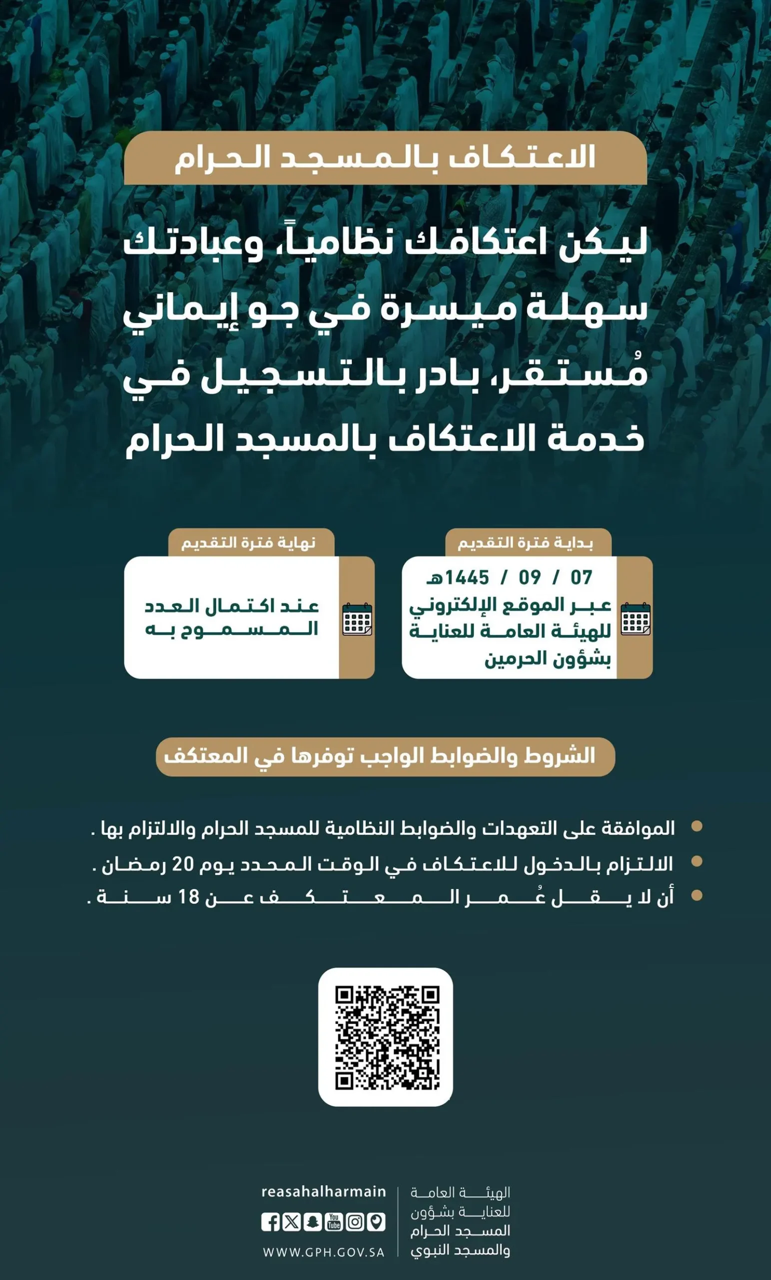 وحددت شروط الاعتكاف كالتالي : الموافقة على التعهدات والضوابط النظامية للمسجد الحرام والالتزام بها، والالتزام بالدخول للاعتكاف في الوقت المحدد يوم 20 رمضان، وأن لا يقل عمر المعتكف عن 18 سنة.