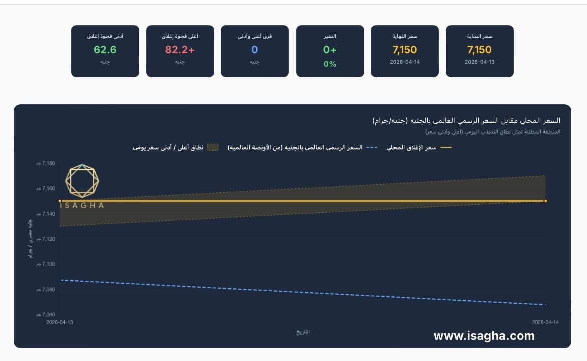 وكشفت منصة «آي صاغة» لتداول الذهب والمجوهرات عبر الإنترنت عن استقرار سعر جرام الذهب عيار 21 الأكثر تداولاً في مصر عند 7,150 جنيهاً، دون تسجيل أي تغيير يُذكر (0%) خلال الفترة محل الرصد، كما سجل سعر جرام الذهب عيار 24 نحو 8,150 جنيهاً، بينما بلغ سعر عيار 18 نحو 6,100 جنيه، مع الحفاظ على الفروق السعرية التقليدية بين الأعيرة المختلفة، في حين ارتفعت الأونصة العالمية بنحو 0.75%، رغم التحركات الصعودية المحدودة التي شهدتها الأسواق العالمية.