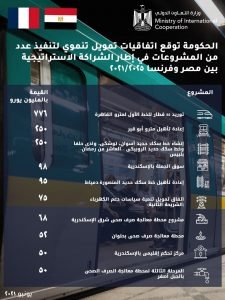 والجدير بالذكر أن فرنسا قامت بتنفيذ العديد من المشروعات الحيوية في عدة مجالات مثل إنشاء مترو الأنفاق بخطوطه الثلاثة، تجهيزات القصر العيني الجديد، إنشاء نظام المعلومات بمكتبة الإسكندرية، محطات الكهرباء، إنشاء وتوسيع سنترالات التليفونات بعدة محافظات، توسيع محطات مياه الشرب والصرف الصحي، وتطوير نظام المراقبة الجوية.