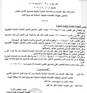 أصدر الدكتور محمد عمران رئيس الهيئة العامة للرقابة المالية، قرارًا رقم 291 لسنة 2022، بشأن إلغاء حظر الصرف من الحسابات الجارية بالبنوك لصندوق التأمين الخاص للعاملين بالهيئات القضائية والجهات المعاونة لها بوزارة العدل.