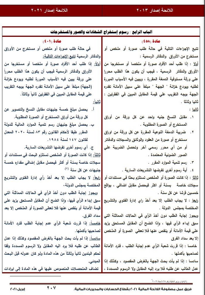 و كانت وزارة المالية قد أصدرت قبل عدة أيام اللائحة التنفيذية الجديدة لقطاع الحسابات والمديرايات الحكومية والتى أظهرت عزم وزارة المالية على زيادة رسوم بعض الأوراق والمستخرجات الرسمية بقيمة 5 جنيهات ، وذلك بمقارنتها بأخر نسخة اللائحة الصادرة عام 2013 .
