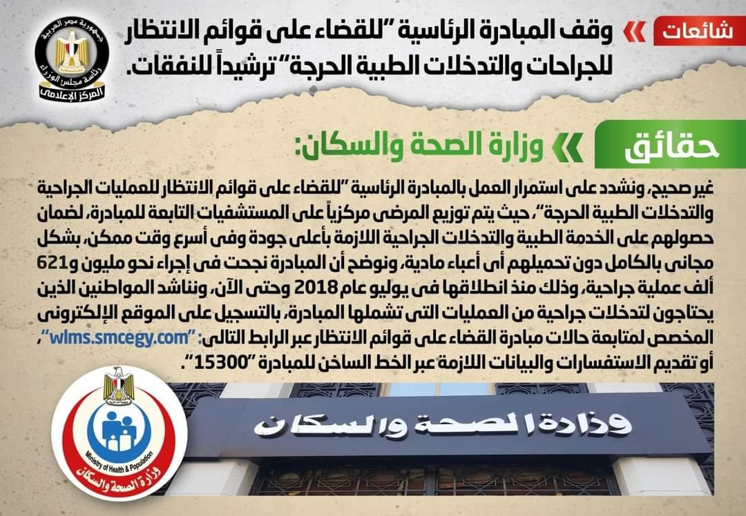 تداولت بعض المواقع الإلكترونية وصفحات التواصل الاجتماعي أنباء بشأن وقف المبادرة الرئاسية “للقضاء على قوائم الانتظار للجراحات والتدخلات الطبية الحرجة” ترشيداً للنفقات، وقد قام المركز الإعلامي لمجلس الوزراء بالتواصل مع وزارة الصحة والسكان، والتي نفت تلك الأنباء، مُؤكدةً أنه لا صحة لوقف المبادرة الرئاسية “للقضاء على قوائم الانتظار للجراحات والتدخلات الطبية الحرجة” ترشيداً للنفقات، مُشددةً على استمرار العمل بالمبادرة الرئاسية “للقضاء على قوائم الانتظار للعمليات الجراحية والتدخلات الطبية الحرجة”، حيث يتم توزيع المرضى مركزيًا على المستشفيات التابعة للمبادرة، لضمان حصولهم على الخدمة الطبية والتدخلات الجراحية اللازمة بأعلى جودة وفي أسرع وقت ممكن، بشكل مجاني بالكامل دون تحميلهم أي أعباء مادية، مُوضحةً أن المبادرة نجحت في إجراء نحو مليون و621 ألف عملية جراحية، وذلك منذ انطلاقها في يوليو عام 2018وحتى الآن، مُناشدةً المواطنين الذين يحتاجون لتدخلات جراحية من العمليات التي تشملها المبادرة، بالتسجيل على الموقع الإلكتروني المخصص لمتابعة حالات مبادرة القضاء على قوائم الانتظار عبر الرابط التالي: “wlms.smcegy.com”، أو تقديم الاستفسارات والبيانات اللازمة عبر الخط الساخن للمبادرة “15300”.