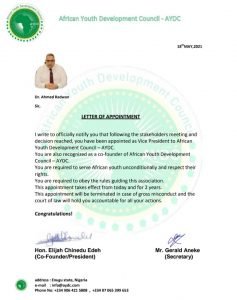 أصدر مجلس تنمية الشباب الافريقى AYDC قرارا رسميا بتعيين الدكتور أحمد رضوان فى منصب رئيس المجلس .
