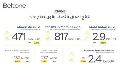 نجحت بلتون القابضة في الحفاظ على مسارها الاستثنائي للنمو خلال النصف الأول من العام الحالي محققة إيرادات تشغيلية بقيمة 2.9 مليار جنيه بنسبة نمو سنوي 818%، محققة صافي ربح بقيمة 817 مليون جنيه بعد خصم الضرائب وحقوق الأقلية، مقارنة بخسارة قدرها 146 مليون جنيه خلال النصف الأول من عام 2023، وجاءت هذه النتائج غير المسبوقة بفضل الأداء القوي لكل من قطاعي بنك الاستثمار والخدمات المالية غير المصرفية مما أسفر عن نمو هامش صافي الربح التشغيلي إلى 64%.