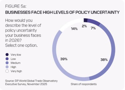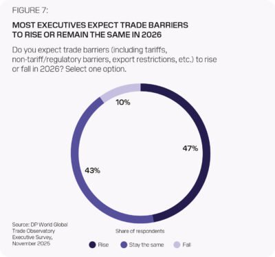 وبصورة إجمالية، تتوقع نسبة 54% من المشاركين في الاستطلاع تسارع نموّ التجارة قياساً على عام 2025، فيما يتوقع 40% منهم بقاء النمو عند المستوى نفسه. ويأتي ذلك على الرغم من توقّع 53% من المشاركين مستويات مرتفعة أو مرتفعة جداً من عدم اليقين في السياسات، كما توقّع 90% منهم زيادة العوائق التجارية أو بقاءها دون تغيير. ولا يتوقع سوى 25% من المشاركين تأثيراً سلبياً على أعمالهم، في حين يرى 49% عدم وجود أي تأثير، فيما يتوقع 26% تأثيراً إيجابياً.