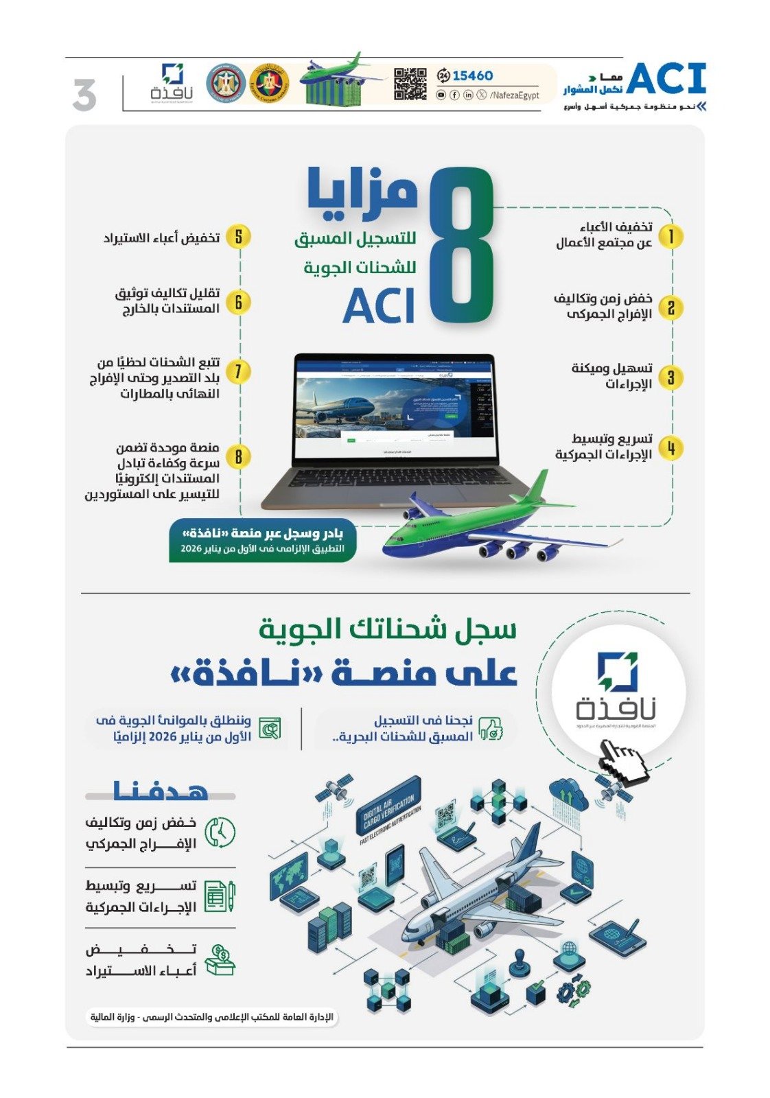 وشدد أموى على أن تطبيق «ACI» الجوي يأتي استكمالًا لنجاح المنظومة في الشحن البحري، وفي إطار التحول من بيئة ورقية إلى رقمية متكاملة عبر منصة «نافذة»، بما يدعم خفض زمن الإفراج، وتقليص تكاليف التشغيل، وتحسين ترتيب مصر في مؤشرات التجارة الدولية، وفتح آفاق جديدة لتعظيم الصادرات الوطنية وتعزيز نفاذها للأسواق العالمية.