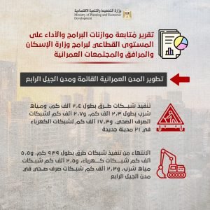 وحول تطوير المدن العمرانية القائمة ومدن الجيل الرابع، أشار التقرير إلى أنه تم تنفيذ شبكات طرق بطول 2.4 ألف كم، ومياه شرب بطول 2.3 ألف كم، و2.7 ألف كم لشبكات الصرف الصحي، و17.3 ألف كم لشبكات الكهرباء في 21 مدينة جديدة، وفي مدن الجيل الرابع، تم الانتهاء من تنفيذ شبكات طرق بطول 939 كم، و5.5 ألف كم شبكات كهرباء، و2.5 ألف كم شبكات مياه شرب، و2.3 ألف كم شبكات صرف صحي.