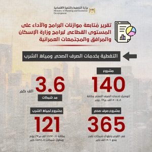 وأوضح التقرير أنه في إطار جهود الدولة لزيادة معدلات التغطية بخدمات الصرف الصحي ومياه الشرب، تم الانتهاء من تنفيذ 140 مشروعاً لتوصيل خدمات الصرف الصحي بطاقة 2014.8 ألف م3/ يوم، ومد شبكات بطول 3.6 ألف كم، فضلاً عن الانتهاء من 365 مشروعاً صرف صحي في القرى بأطوال شبكات تقدر بنحو 3.6 ألف كم، علاوةً على تنفيذ 121 مشروعاً لمياه الشرب بطاقة 2230.7 ألف م3/ يوم وبطول شبكات 1538.8 كم.