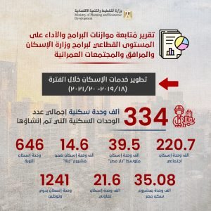 وتطرق التقرير إلى الجهود التي قامت بها الدولة في مجال تطوير خدمات الإسكان خلال الفترة (18/2019- 20/2021)، مبيناً أنه تم الانتهاء من إنشاء 220.7 ألف وحدة إسكان اجتماعي، و 39.5 ألف وحدة إسكان متوسط “دار مصر”، 14.6 ألف وحدة إسكان ضمن مشروع “جنة”، ومشروع سكن مصر 35.08 ألف وحدة و 21.6 ألف وحدة إسكان تعاوني، فضلاً عن إنشاء 1241 وحدة إسكان بدوي وتوطين، و646 وحدة إسكان النوبة، ليصل إجمالي عدد الوحدات السكنية التي تم إنشاؤها إلى حوالي 334 ألف وحدة سكنية.