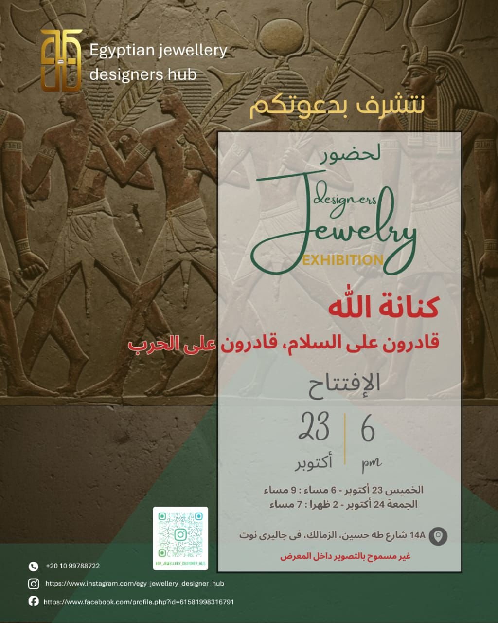 تعقد “منصة مصممي الحلي والمجوهرات المصريين” أولى فعالياتها بمناسبة افتتاح المتحف المصري الكبير، والتي تتمثل في معرض للتصميمات بعنوان “كنانة الله.. قادرون على السلام، قادرون على الحرب”، حيث يقدم المشاركون في المعرض مجموعة تصميمات مستوحاة من تاريخ ورموز الحروب التي خاضتها مصر منذ القدم وحتى الآن، وتم توظيف الموتيفات التي تم استلهامها من معروضات المتحف الحربي في القلعة لعمل تشكيلة من تصميمات المجوهرات قابلة للتنفيذ.