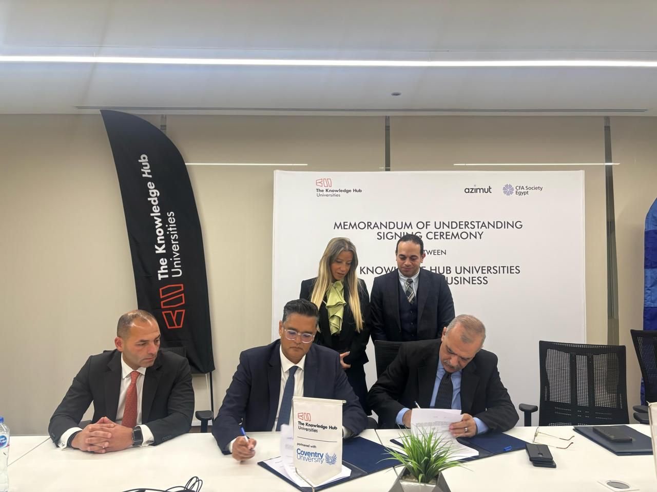 The MoU was signed by Mr. Ashraf El-Khatib, Vice Chairman of the CFA Society Egypt, and Professor Dr. Yasser Sakr, President of The Knowledge Hub Universities, in the presence of Mr. Ahmed Abou El-Saad, President of CFA Society Egypt, Dr. Shahira Samir, Vice President of Knowledge International Universities, Dr. Rasha El Gendi, Head of TKH— Coventry School of Business, Dr. Marian Hany, Course Director – Accounting and Finance, and Dr. Hossam Omara, Deputy Course Director – Accounting and Finance at TKH— Coventry School of Business, and a number of representatives from both sides.