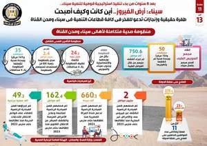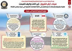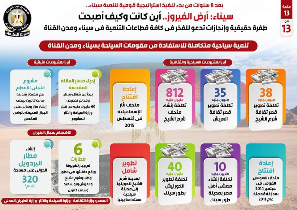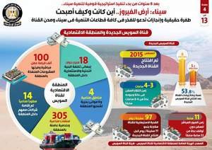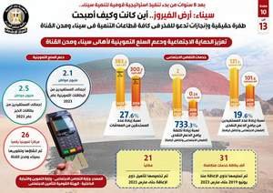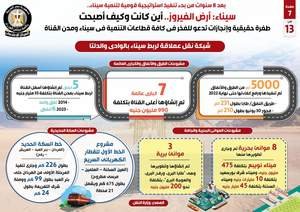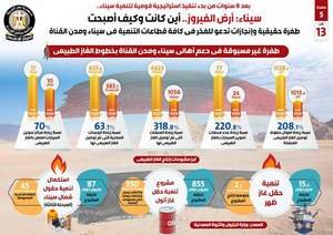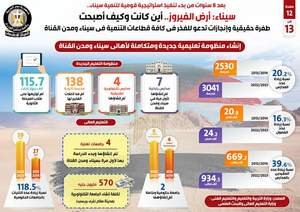 وفي هذا الصدد، نشر المركز الإعلامي لمجلس الوزراء تقريراً يتضمن إنفوجرافات بعنوان سيناء أرض الفيروز.. أين كانت وكيف أصبحت، لتسليط الضوء على الطفرة الحقيقية والإنجازات في كافة قطاعات التنمية في سيناء ومدن القناة بما يدعو للفخر، وذلك بعد 8 سنوات من بدء تنفيذ استراتيجية قومية لتنمية سيناء.