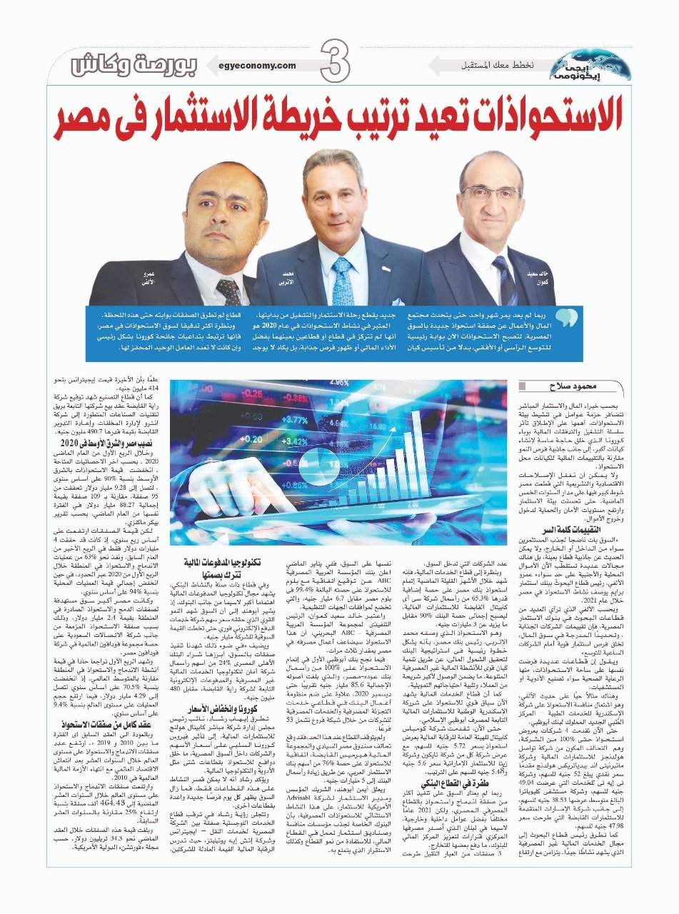 “السوق بات ناضجا لجذب المستثمرين سواء من الداخل أو الخارج، ولا يمكن الحديث عن جاذبية قطاع بعينة، بل هناك مجالات عديدة تستقطب الآن الأموال المحلية والأجنبية على حدٍ سواء” عمرو الألفي، رئيس قطاع البحوث ببنك استثمار برايم يوصف نشاط الاستحواذ في مصر خلال عام 2021.