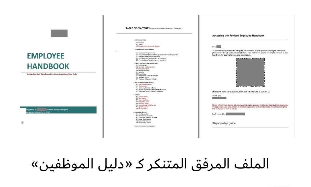 The attached document, posing as an updated “Employee Handbook,” does not contain any actual guidelines – only a title page, a table of contents with the items that have supposedly been changed highlighted in red, a page with a QR code, supposedly for going to the full document and common instructions on how to read QR codes using a phone. The document features the victim’s name multiple times to convince that this document was created specifically for them.